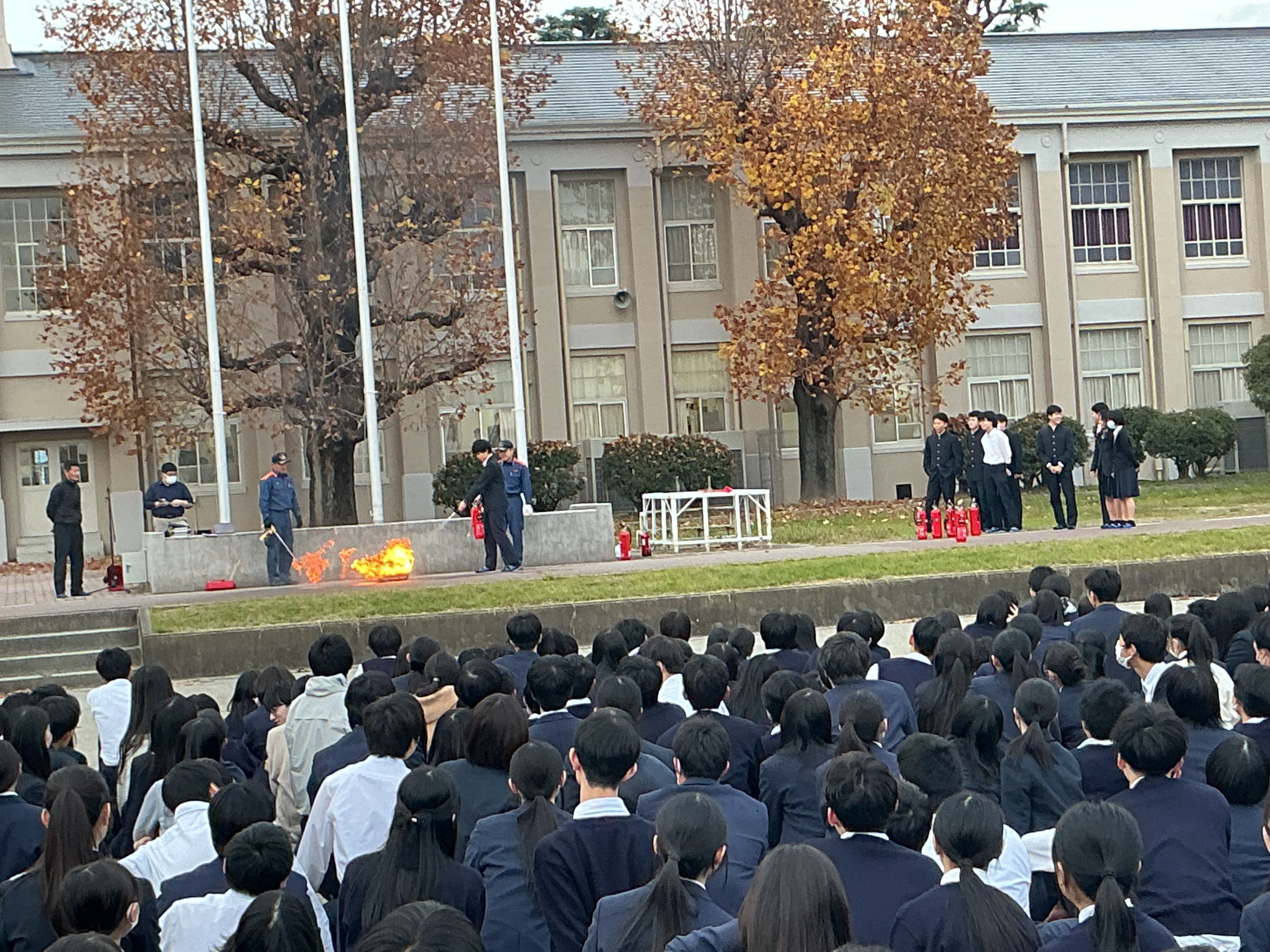 11月17日に火災避難訓練を行いました。 火災発生現場(想定)は訓練開始後に判明する形式での実施でしたが、生徒・職員、臨機応変に即座に避難ができていました。 第1グランドへの避難完了後には、3年生による消火訓練も実施されました。